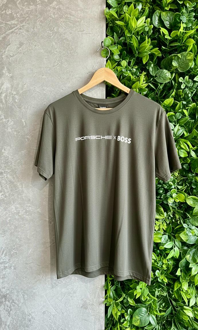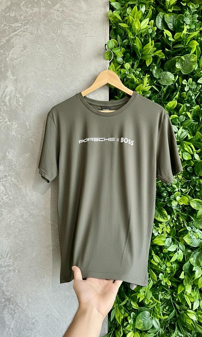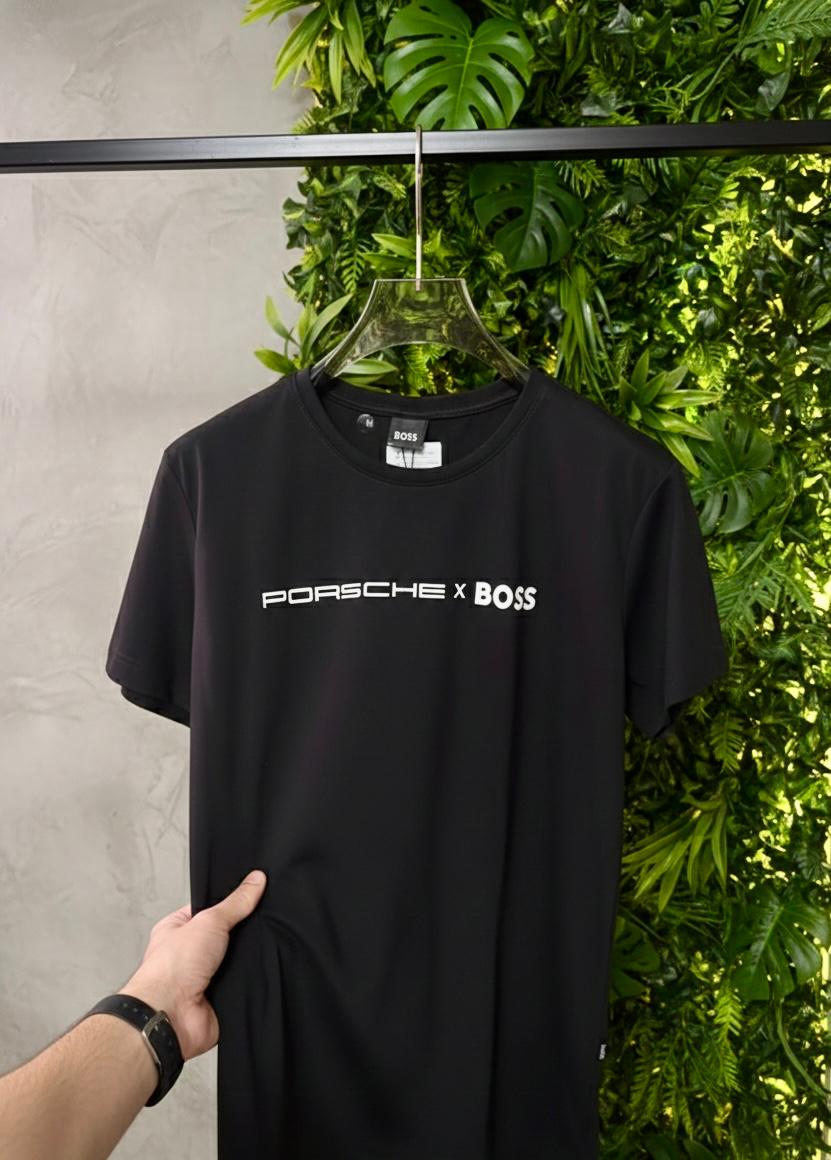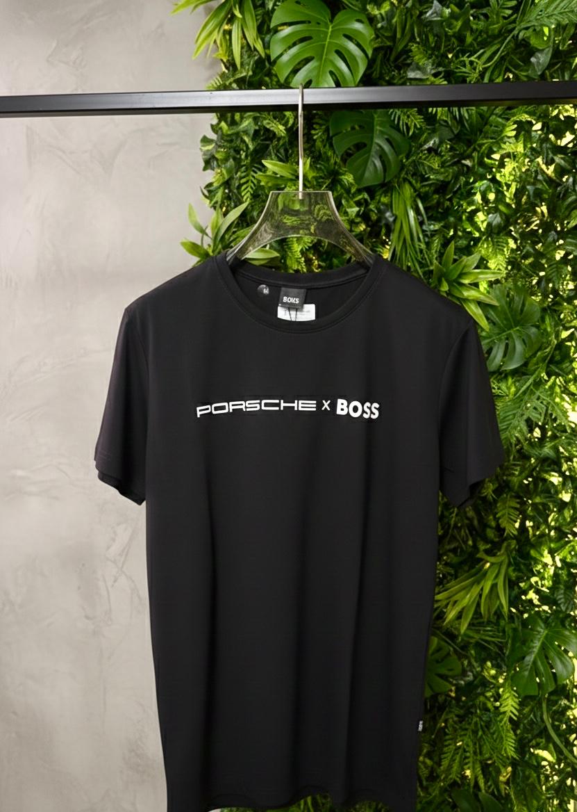Collab Exclusiva: Estampa frontal minimalista PORSCHE x BOSS, simbolizando uma parceria de elite e bom gosto.