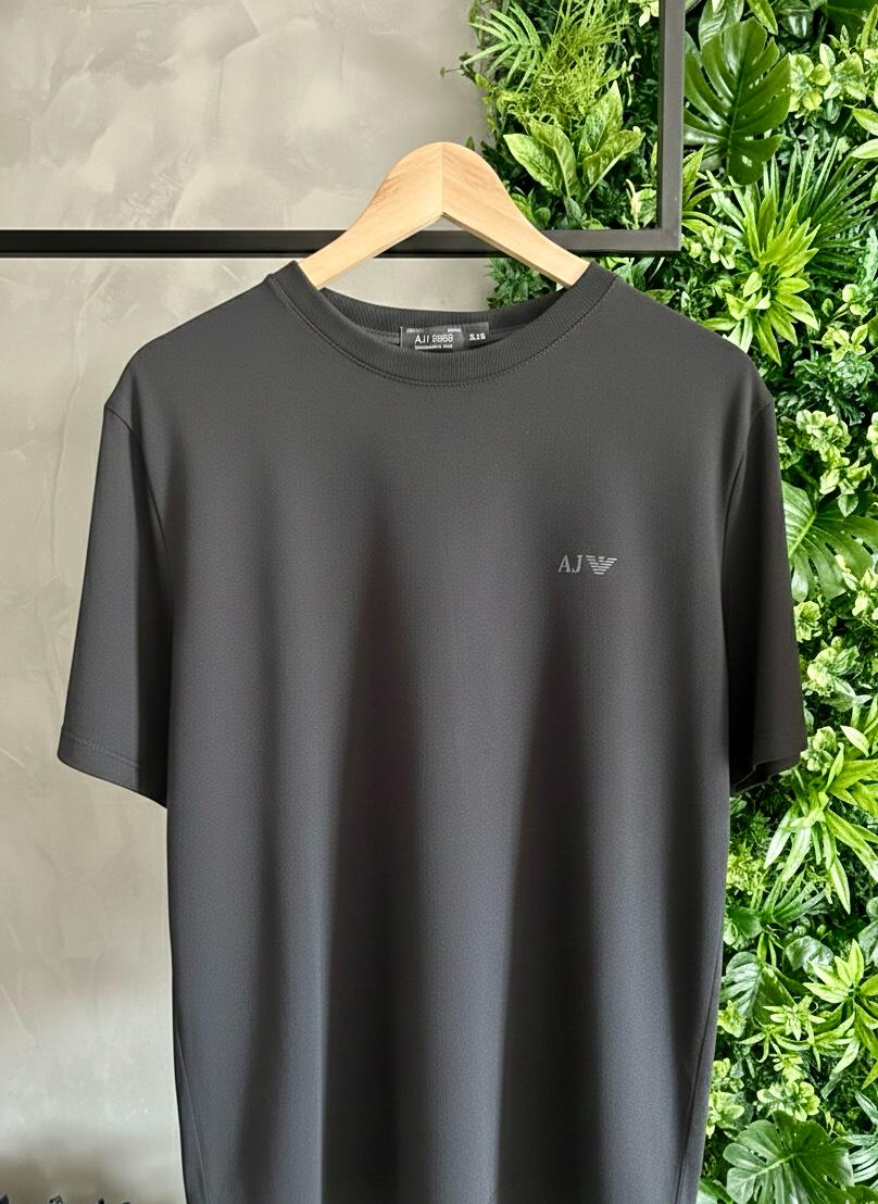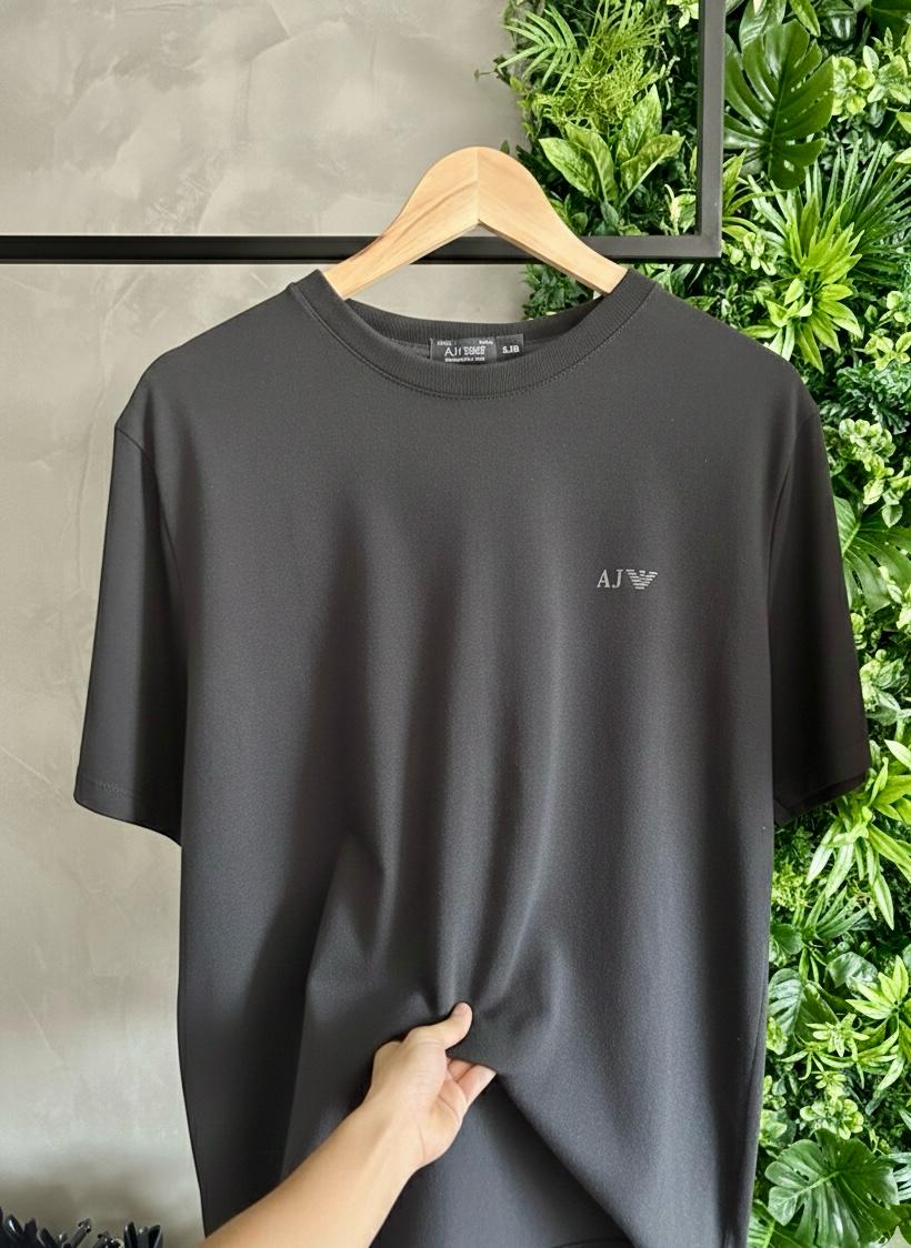 Se você busca o equilíbrio perfeito entre luxo e discrição, a Camiseta Armani Jeans é a peça que não pode faltar no seu setup. Com um tom grafite profundo e o icônico logo AJ com a águia em detalhe minimalista no peito, ela redefine o conceito de básico premium.