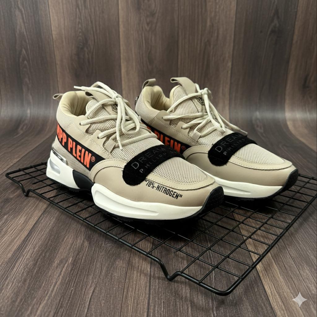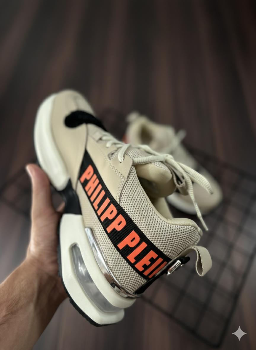 O tênis Philipp Plein é para quem não aceita o comum. Com uma estética robusta e agressiva, ele mistura materiais premium com uma paleta de cores moderna em bege, preto e detalhes vibrantes em laranja. É a peça central de qualquer outfit de alto nível.